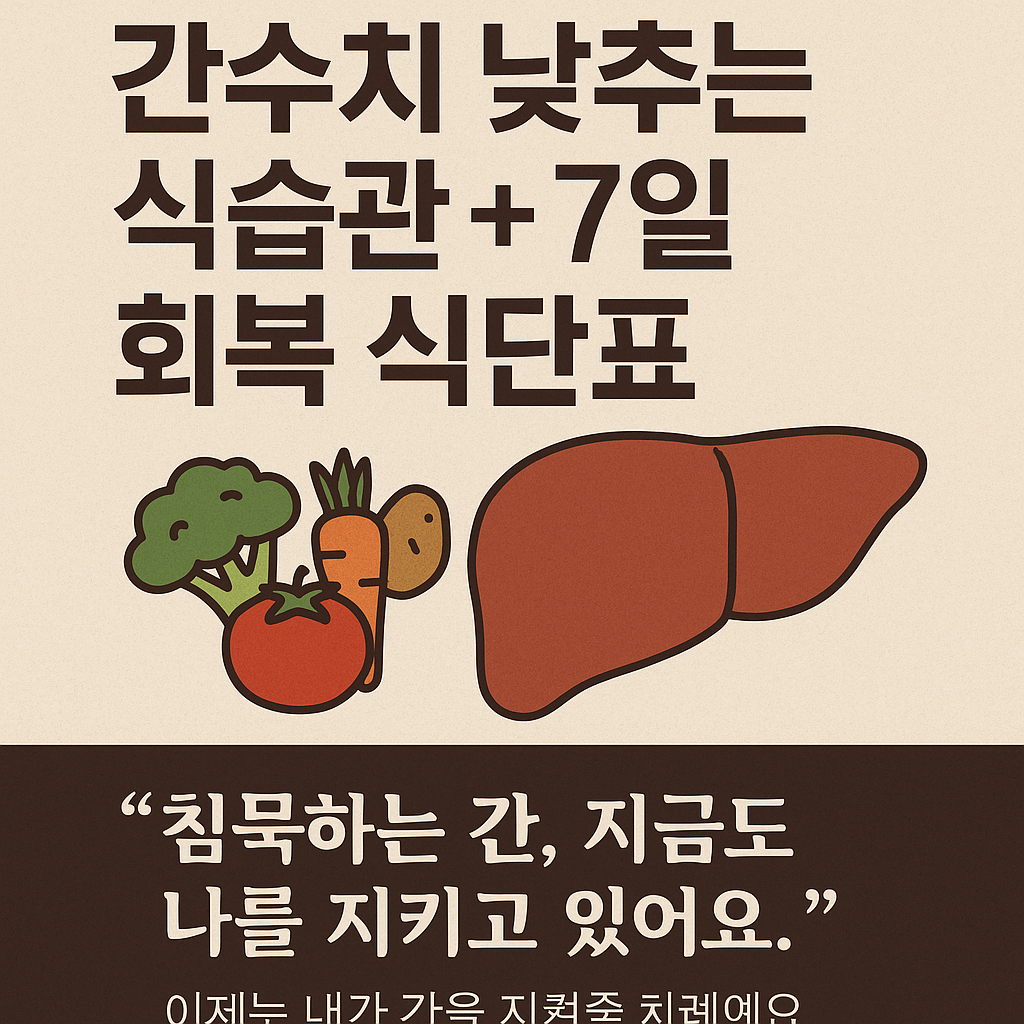 프롤로그"간수치가 높습니다. 식습관 조절이 필요해요."많은 사람들이 건강검진 결과지에서 처음 듣게 되는 경고입니다.하지만 간은 증상이 거의 없고, 통증도 느껴지지 않는 장기이기 때문에자각 없이 손상되기 쉬운 ‘침묵의 장기’로 불립니다. ALT (GPT), AST (GOT), γ-GTP 수치가 높다면?→ 이미 간세포가 손상되어 효소가 혈중으로 유출되었다는 의미입니다.이런 상태에선 무엇을 먹고, 무엇을 피하느냐가 회복의 핵심입니다.오늘은 간수치 개선에 도움되는 전문 식습관 전략 + 7일 회복 식단표를의학적 근거와 함께 정리해드립니다.1. 간수치(간효소 수치)란? 지표 기준치기능 의미ALT (GPT)0~40 U/L간세포 내부에 존재간세포 손상 시 혈중 유출AST (GOT)0~40 U/L간 외에도 심장, 근육에..