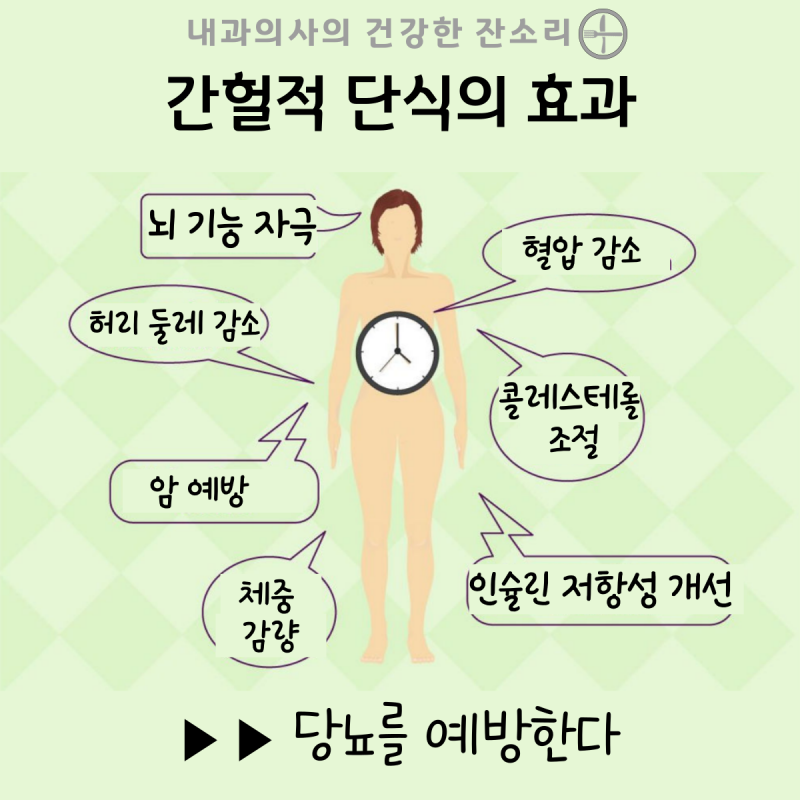 • 간헐적 단식은 혈당을 안정적으로 유지하고, 인슐린 저항성을 개선하는 효과가 있어!