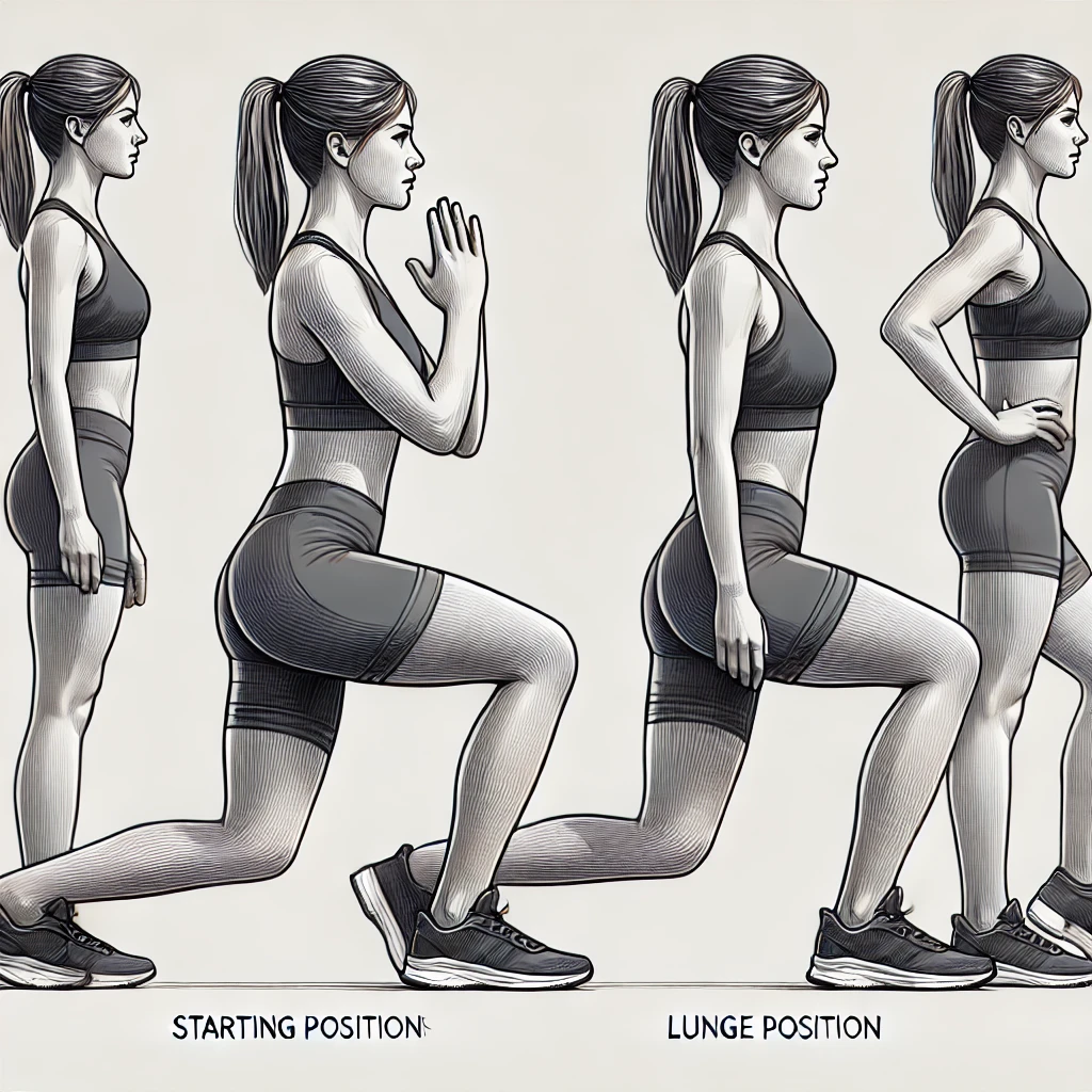 • 런지: 둔근과 허벅지 근육 강화, 양쪽 다리 각각 12회 X 3세트