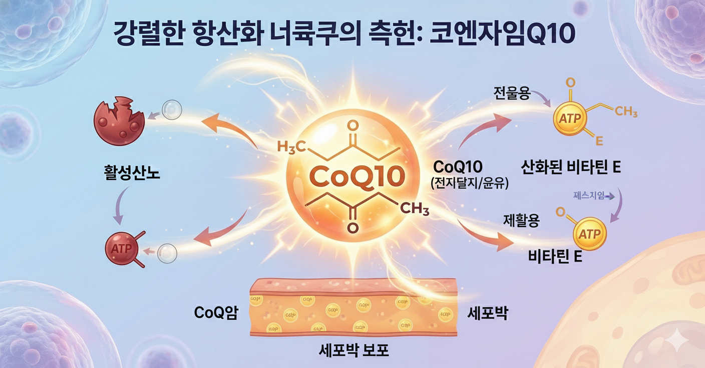 • 비타민 E의 재활용: 흥미로운 점은 코큐텐이 이미 사용되어 산화된 비타민 E를 다시 원래의 항산화 상태로 되돌려준다는 것입니다. 이를 '항산화 네트워크'라고 부르는데, 코큐텐은 이 네트워크가 끊기지 않게 돕는 핵심 연결고리입니다.