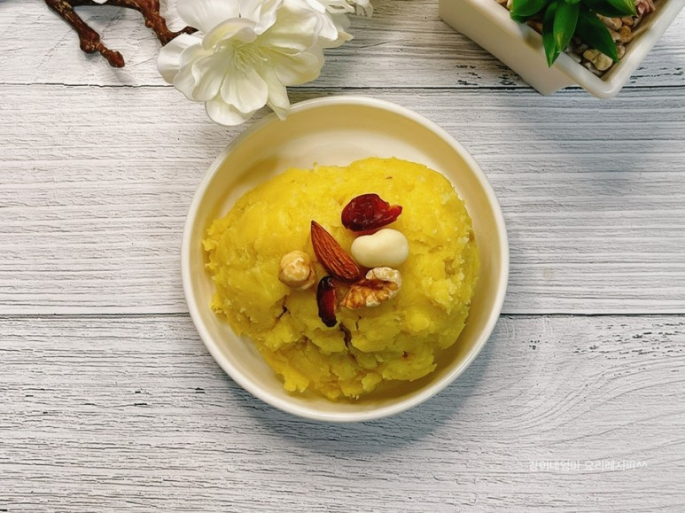 1. 고구마 찐 후 으깨서 그릭요거트 & 견과류 & 꿀 약간 넣기.